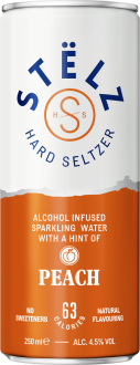 STËLZ hard seltzer peach bestaat uit bruiswater, een vleugje perzik en 4,5% alcohol. Geen suiker, geen koolhydraten, geen gluten en 63 calorieën per 25cl blikje.