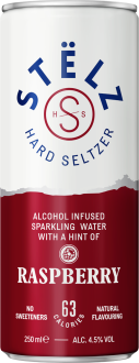 STËLZ hard seltzer raspberry bestaat uit bruiswater, een vleugje mango en 4,5% alcohol. Geen suiker, geen koolhydraten, geen gluten en 63 calorieën per 25cl blikje.