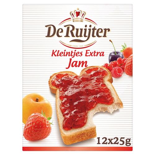 Ingrediënten: Extra aardbeienjam: aardbeien, suiker, glucose-fructosestroop, geleermiddel (pectine), voedingszuur (citroenzuur), vlierbessapconcentraat, bereid met 50 g vruchten per 100 g., Extra kersenjam: kersen, suiker, glucose-fructosestroop, geleermiddel (pectine), voedingszuur (citroenzuur), bereid met 50 g vruchten per 100 g., Extra abrikozenjam: abrikozen, suiker, glucose-fructosestroop, geleermiddel (pectine), voedingszuur (citroenzuur), bereid met 50 g vruchten per 100 g., Extra frambozenjam: frambozen, suiker, glucose-fructosestroop, geleermiddel (pectine), voedingszuur (citroenzuur), bereid met 50 g vruchten per 100 g., Extra vier vruchtenjam: vruchten (aardbeien, rode bessen, kersen, frambozen), suiker, glucose-fructosestroop, geleermiddel (pectine), voedingszuur (citroenzuur), bereid met 50 g vruchten per 100 g.
