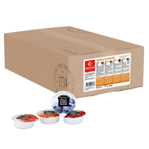 Fruitbeleg aardbei (suiker, 35% aardbeien, glucose-fructosestroop, geleermiddel (pectine), voedingszuur (citroenzuur), wortel- en zwartebesconcentraat , conserveermiddel (E202)), fruitbeleg abrikoos (suiker, 35% abrikozen, glucose-fructosestroop, water, geleermiddel (pectine), voedingszuur (citroenzuur), conserveermiddel (E202)), fruitbeleg kers (suiker, 36% kersen, glucose-fructosestroop, geleermiddel (pectine), voedingszuur (citroenzuur), conserveermiddel (E202)), fruitbeleg bosbes (suiker, 36% bosbessen, glucose-fructosestroop, geleermiddel (pectine), voedingszuur (citroenzuur), conserveermiddel (E202))