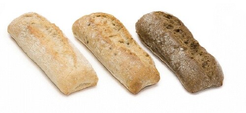 Een mix van 3 soorten kleine langwerpige rustieke tafelbroodjes, bebloemd en voorzien van een insnijding. vloeroven gebakken en diepgevroren.