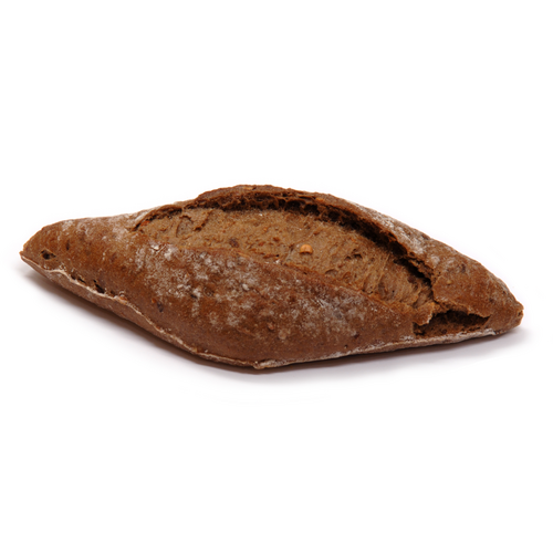 Een op de vloeroven gebakken diepgevroren ruitvormig donker meergranenbroodje, gedecoreerd met granen en zaden.