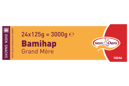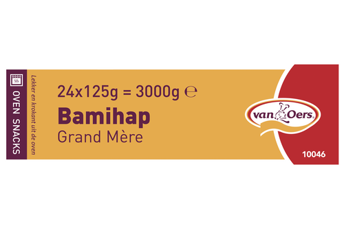 45% gekookte mie (water, TARWEBLOEM), paneermeel (TARWEBLOEM, zout, gist, kleurstof: E160b(i), E160b(ii)), plantaardige oliën (zonnebloem, palm, raapzaad), water, gedroogde groenten (ui, prei, KNOLSELDERIJ, paprika), ketjap (suikerstroop, suiker, sojasaus (water, SOJABONEN, TARWE, zout), water, zout, azijn, natuurlijke aroma, kleurstof (E150d), salmiak), gedroogde glucosestroop, zout, suiker, TARWEBLOEM, specerijen, smaakversterker (E621), sambal (rode pepers, zout, voedingszuur (E260), conserveermiddel (E211)), glucosestroop, verdikkingsmiddel (E1404), basterdsuiker (suiker, suikerstroop), gistextract, aroma, donkere basterdsuiker (suiker, suikerstroop, kleurstof (karamel)), gehydrolyseerd SOJA-EIWIT, dextrose, emulgator (E466, E471), kleurstof (karamel), TARWEBLOEM, KIPPENEI-EIWIT, kruiden, citroensap, aardappelzetmeel, uienolie.