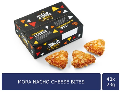 44% vegetarische kaasvulling (water, 22% Goudse kaas (melk), 12% extra gerijpte Cheddar kaas (melk), boter (melk), kruidenmix (dextrose, paprika, natuurlijk aroma, kruiden, specerijen, ui, knoflook, zout, citroenconcentraat, maltodextrine, gistextract, raapzaadolie), melkeiwitten, gemodificeerd aardappelzetmeel, emulgatoren: E331, E452, bamboevezel, zuurteregelaars: E500, E330, zout, zonnebloemolie, stabilisator: E461, kleurstof: annatto bixine), paneermeel (tarwebloem, zout, gist, kurkumapoeder, paprikapoeder, kleurstoffen: paprika-extract, curcumine), doorhaalmiddel (water, glucosestroop, witte basterdsuiker (suiker, invertsuikerstroop), tarwebloem, dextrose, stabilisatoren: E464, E466, zout, tarwe-eiwit), 9% cornflakes (maïs, zout, gerstemout), plantaardige oliën (palm, raapzaad, zonnebloem), 5% tortilla (bloem (tarwe, maïs), zout, suiker, emulgator: E471).