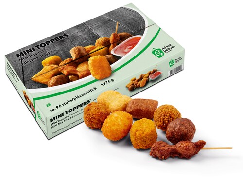 De ad van geloven minitoppers: een gevarieerde mix van acht minisnacks. de mix bevat een mini-frikandel, bitterbal, kaashapje, kippet, mini-bami oriëntal, mini-nasi oriëntal, mini-gehaktbal en een mini-kipsaté. acht toppers van ad van geloven!