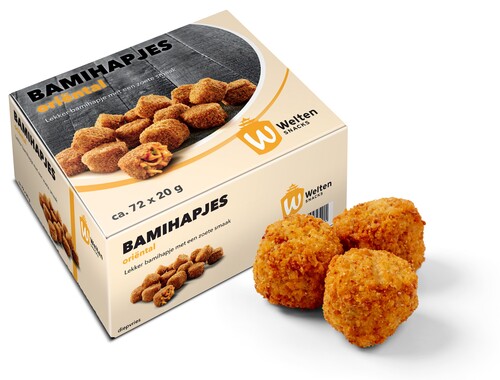 gekookte mie (tarwe), paneermeel (tarwebloem, volkorentarwemeel, zonnebloemolie, gist, zout), water, groenten (prei, ui, paprika, kool, knoflook), kruidenmix (dextrose, smaakversterkers: E621, E627 en E631, zout, specerijen, knoflook, ui, aroma (bevat soja, tarwe), kleurstoffen: paprika-extract en karamel), suiker, ketjap (suiker, melasse, water, sojasaus (water, sojabonen, tarwe, zout), zout, azijn, zetmeel, aroma), tomatenketchup (tomatenpuree, glucose-fructosestroop, azijn, gemodificeerd zetmeel, zout, suiker), rundergelatine, gemodificeerd zetmeel, margarine (plantaardige oliën (palm, koolzaad, kokos), water, zout, kleurstof: caroteen), sambal (rode pepers, zout), tarwebloem, stabilisatoren: guargom en E466, inuline, aroma (bevat tarwe, selderij), zout, trassipoeder (meel, zout, garnaal), rijsmiddelen: E450 en E500