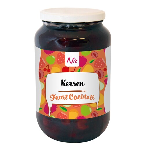 55% kersen, glucose- fructosestroop, sacharose, water, verdikkingsmiddel E1422, conserveermiddel E202