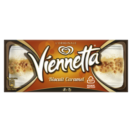 Ijs met karamelsmaak en ijs met vanillesmaak tussen krokante laagjes met karamelsmaak (10%), met laagjes biscuit (13%) en stukjes met karamelsmaak (1%).