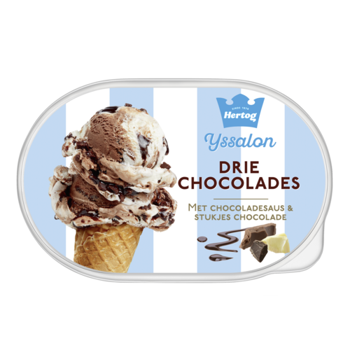 Witte chocolade-ijs (waarvan 8% witte chocolade) en melkchocolade-ijs (waarvan 5% melkchocolade) met chocoladesaus (19%) en stukjes chocolade (3%).