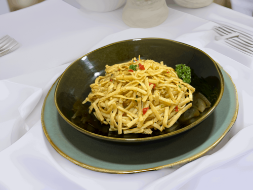 gekookte mie (79%) (water, harde tarwegriesmeel), varkensvlees (8%), groenten (5%) (ui, prei, paprika, kool), gehydrolyseerd soja-eiwit, raapolie, ketjap (melasse, water, gehydrolyseerd soja-eiwit, azijn, gefermenteerde sojasaus (water, sojabonen, tarwe, zout), zout, salmiakzout), margarine (plantaardig olie (palm, raap), water, zout, emulgatoren: mono- en diglyceriden van vetzuren, zonnebloemlecithine, voedingszuur: citroenzuur, vitamine a, vitamine d), zout, sambal (chilipeper, zout, voedingszuur: E260), bamikruiden (specerijen, ui, maltodextrine, paprika).