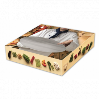 Geef maaltijden, broodjes, vlees- en saladeschalen, gourmet- en visschotels een luxueuze en herkenbare presentatie in deze stevige kartonnen cateringdozen. De stapelbare dozen zijn gemakkelijk te vervoeren en kunnen zo in de koelkast.