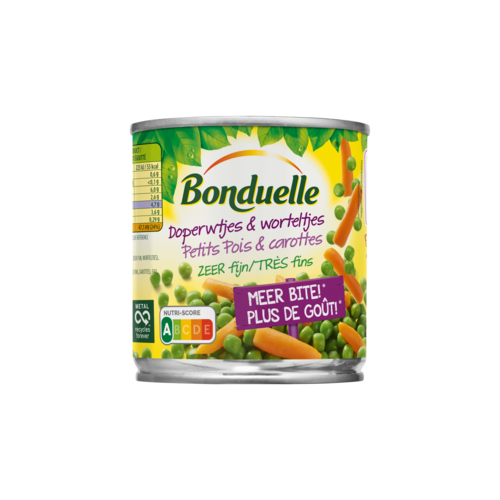 Ingrediënten: Groenten in variabele proporties (doperwtjes zeer fijn, worteltjes), water, zout, natuurlijk aroma.