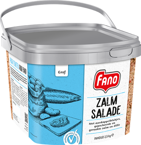 Ingrediënten: 49% aardappel, 28% gepocheerde en gerookte zalm, water, raapolie, suiker, azijn, 2,5% wortel, tomaat, zout, scharrelei-eigeel, maïszetmeel, glucosestroop, tarwevezel, voedingszuur: melkzuur, conserveermiddelen: E202, E211, mosterdzaad, gemodificeerd maïszetmeel, gemodificeerd aardappelzetmeel, vispoeder, kruiden (selderij), gistextract, specerijen, specerijenextract, 0,05% dille, verdikkingsmiddelen: xanthaangom, guargom, kleurstoffen: E160e, betacaroteen, citroensapconcentraat, natuurlijke aroma's. *De gebruikte tarwevezel is glutenvrij. Dit product kan sporen van pinda's en noten bevatten.