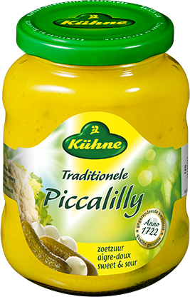 water, groenten 23% (zilveruien, augurken, bloemkool), natuurazijn, suiker, TARWEBLOEM, MOSTERDZADEN, zout, raapzaadolie, curcuma, specerijen