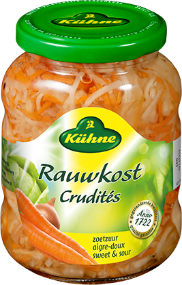 groenten 54 % in wisselende verhouding (wortelen, witte kool, KNOLSELDERIJ, rode paprika, uien), glucose-fructosestroop, suiker, natuurazijn, zout, natuurlijk kruidenaroma