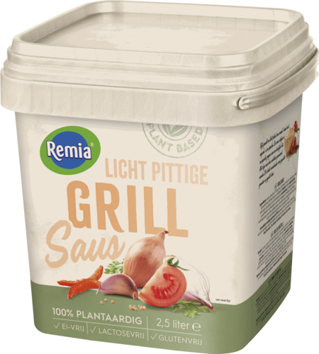 Remia grillsaus is rijk gevuld, licht pikant en bereid met verse stukjes ui en paprika. dé ideale smaakmaker bij een hamburger en gegrild vlees. plantaardig, lactosevrij en natuurlijk glutenvrij. verpakt in een 2,5l emmer.