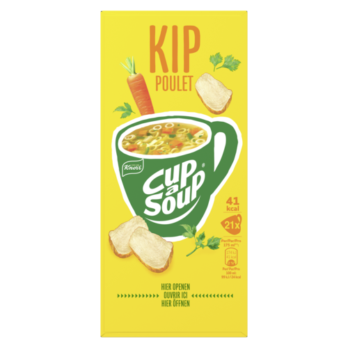 Deegwaar 24% (TARWEGRIES, zout), dextrose, zetmeel, aroma, wortel 4,8%, zout, gistextract, suiker, palmvet, stukjes kippenvlees 2,3% (kippenvlees, palmolie, zout, antioxidanten (E304i, E307)), mineraalzout (kalium), gejodeerd zout, kippenvet 0,9% (kippenvet, antioxidant: rozemarijnextract), prei, specerijen (kurkuma, peterseliewortelpoeder), uipoeder, BLADSELDERIJ 0,2%. Kan ROGGE, GERST, HAVER, EI, SOJA, MELK, MOSTERD bevatten.