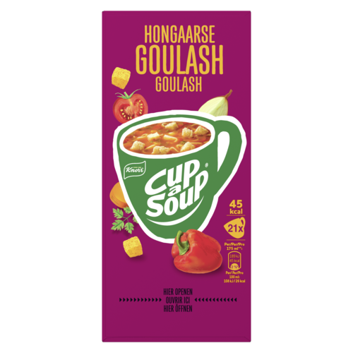 Aardappelzetmeel, deegwaar 11% (harde TARWEGRIES, zout), tomatenpuree¹ 10%, aardappel¹, croutons 8,4% (witbrood (TARWEBLOEM, zout, gist, raapzaadolie), palmolie, antioxidant: rozemarijnextract), aroma, zout, paprikapoeder¹ 3,9%, suiker, maltodextrine, gistextract, rundvleesgranulaat 2% (rundvlees, zout, maltodextrine, gedroogd EI-EIWIT), maïsolie, rode paprika¹ 1,7%, gejodeerd zout, MELKWEI, ui¹ 1,2%, mineraalzout (kalium), rundvleesextract 0,9%, MELKSUIKER, geconcentreerd groentensap¹ (KNOLSELDERIJ, wortel 0,1%, prei, ui), TARWEBLOEM, knoflookpoeder¹, peterselie¹ 0,2%, witte wijnextract, rookaroma, peterseliewortel¹. Kan soja, mosterd bevatten. ¹ op duurzame wijze geteeld.