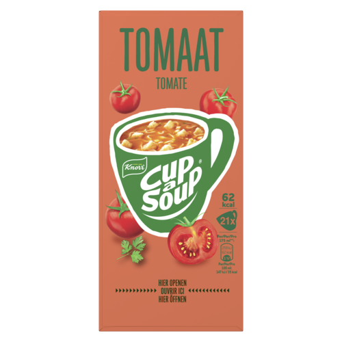 Ingrediënten: Tomaat¹ 38%, aardappelzetmeel, croutons 11% (witbrood (TARWEBLOEM, zout, gist, raapzaadolie), palmolie, antioxidant: rozemarijnextract), suiker, deegwaar 8% (harde TARWEGRIES, zout), gistextract, gejodeerd zout, dextrose, zout, uipoeder¹, maïsolie, mineraalzout (kalium), glucosestroop, specerijen (knoflookpoeder¹, peper), peterselie¹ 0,5%, geconcentreerd groentensap¹ (KNOLSELDERIJ, wortel, prei, ui). Kan ei, melk, mosterd, soja bevatten. ¹ op duurzame wijze geteeld.
