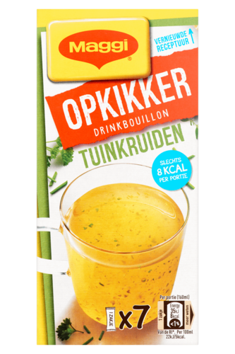 Ingrediënten: Zout, glucosestroop, gistextract, mineraalzout (kalium), suiker, aroma's (bevat SELDERIJ), kruiden en specerijen 3,3% (peterselie, bieslook, dragon, witte peper), groenten (ui 1,5%, tomaat 0,9%), zonnebloemolie, kruidenextracten (SELDERIJ, tijm, basilicum). Bevat mogelijk melk, ei, gluten.
