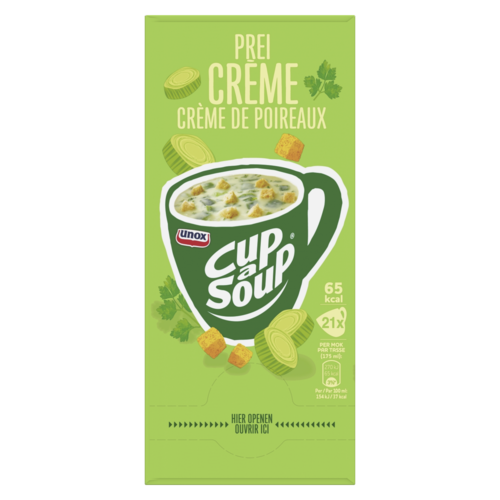 Ingrediënten soeppoeder: Aardappelzetmeel, palmvet, ui, glucosestroop, zout, croutons 7,5% (witbrood (TARWEBLOEM, zout, gist), palmvet, gisthydrolysaat, MELKSUIKER, zout, MELKWEI, specerijen (bevat MOSTERD), gistextract, KAAS (Emmental), ui, aroma, antioxidant: rozemarijnextract), prei 6,8%, gistextract, MELKEIWITTEN, KNOLSELDERIJ, specerijen (knoflook, nootmuskaat, kurkuma), spinazie, peterselie 0,3%, suiker, citroensap, aroma (bevat SELDERIJ). Kan ei bevatten.