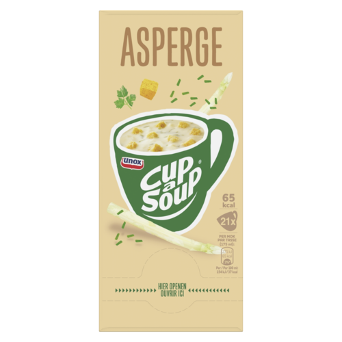 Zetmeel (aardappel, maïs), palmvet, asperge¹ 9,3%, dextrose, croutons 7,1% (witbrood (TARWEBLOEM, zout, gist), palmvet, gisthydrolysaat, MELKSUIKER, zout, MELKWEI, specerijen (bevat MOSTERD), gistextract, KAAS (Emmental), uipoeder, aroma, antioxidant: rozemarijnextract), glucosestroop, zout, gistextract, suiker, suikermaïspoeder¹, aroma, gejodeerd zout, MELKEIWITTEN, mineraalzout (kalium), maïsolie, geconcentreerd groentesap¹ (KNOLSELDERIJ, wortel, ui, prei), kruiden¹ (peterselie 0,2%, bieslook 0,2%), kurkuma¹. Kan ei, soja bevatten. ¹ op duurzame wijze geteeld.