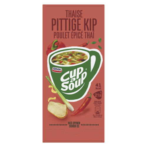 Aardappelzetmeel, pannenkoekreepjes 10% (TARWEBLOEM, EIPOEDER, zetmeel, zout, magere MELKPOEDER, MELKWEI, aroma), deegwaar 10%, (harde TARWEGRIES, zout), suiker, gejodeerd zout, uipoeder¹, gistextract, glucosestroop, zout, stukjes kippenvlees 2,5% (kippenvlees, palmolie, zout, antioxidant (E304i, E307)), kippenvet 2,5% (kippenvet, antioxidant: E392), Chinese paddenstoel 2,2%, citroensappoeder (suiker, citroensap, zout), lente-ui¹ 1,3%, rode paprika¹ 1,3%, citroengras 1,1%, aroma, specerijen 0,6% (knoflook¹, kurkuma¹, cayennepeper), kippenvleespoeder 0,6% (kippenvlees, zout, antioxidant: E392), garnalen 0,2%. Kan weekdieren, vis, soja, selderij, mosterd bevatten. ¹ op duurzame wijze geteeld.