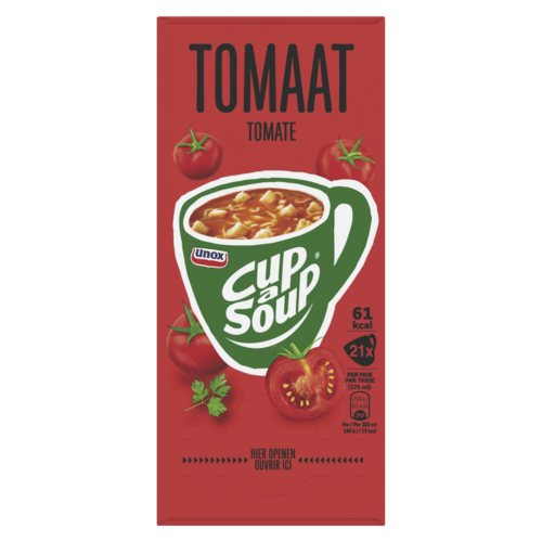 Ingrediënten: Tomaat¹ 38%, aardappelzetmeel, croutons 11% (witbrood (TARWEBLOEM, zout, gist, raapzaadolie), palmolie, antioxidant: rozemarijnextract), suiker, deegwaar 8% (harde TARWEGRIES, zout), gistextract, gejodeerd zout, dextrose, zout, uipoeder¹, maïsolie, mineraalzout (kalium), glucosestroop, specerijen (knoflookpoeder¹, peper), peterselie¹ 0,5%, geconcentreerd groentensap¹ (KNOLSELDERIJ, wortel, prei, ui). Kan ei, melk, mosterd, soja bevatten. ¹ op duurzame wijze geteeld.