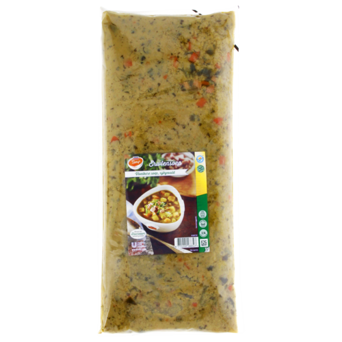 Water, groenten (erwt(18%), wortel (5,5%), prei (4,8%), ui (2,9%), SELDERIJ (1,8%)), aardappel (5,5%), rookworst (3,9%) (varkensvlees (90%) (waarvan 15% separatorvlees),water, zout, varkenscollageen, stabilisator (E451, E452), dextrose, suiker, aroma, conserveermiddel (E250), houtrook), erwtenmeel, raapzaadolie, zout, gemodificeerd maïszetmeel, gistextract (bevat GERST), specerijen (witte peper, SELDERIJZAAD), kruiden (marjolein, laurier), fructose, maltodextrine, rookaroma, aroma, kleurstof (E101), balsamico-azijn poeder (wijnazijn, druivenmost), witte wijnextract. Kan melk, ei en mosterd bevatten.