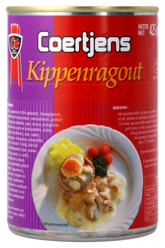 Water, kippenvlees (30% gekookt), champignons, gemodificeerd maïszetmeel, maïszetmeel, gedeeltelijk geharde palmolie, zout, LACTOSE, margarine (geraffineerde en gedeeltelijk geharde plantaardige vetten en oliën (palm, kopra, koolzaad), water, zout, emulgator: SOJALECITHINE, suiker, aroma (bevat MELK)), dierlijk vet, bouillonpoeder (zout, aroma (bevat SOJA, GLUTEN, EI, MELK), gemodificeerd zetmeel, LACTOSE, gedeeltelijk gehard palmvet, kippenvlees), MELKEIWITTEN, kruiden en specerijen, stabilisator: guarpitmeel en xanthaangom, antioxidant: ascorbinezuur, voedingszuur: citroenzuur. Kan sporen bevatten van aardnoten, noten, selderij en mosterd.