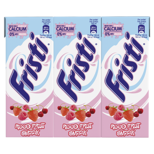 Ingrediënten: (B+NL) magere gefermenteerde melk, vloeibare melkbestanddelen (weipermeaat), water, multivruchtensap uit geconcentreerd sap 2% (appel, 0,9% vlierbes, 0,01% aardbei, 0,01% framboos, 0,01% kers), suiker, fructosestroop, stabilisatoren: pectine, guargom, dikaliumfosfaat en trinatriumcitraat, voedingszuur: melkzuur, aroma, kleurstof: karmijn.